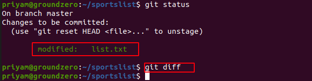 Giit status tells that the file is modified and Changes to be committed. We can also verify the if the files are staged by checking difference between the working area and Index area using command git diff. In the above screenshot, we see no result of the command git diff because there is no difference to show.